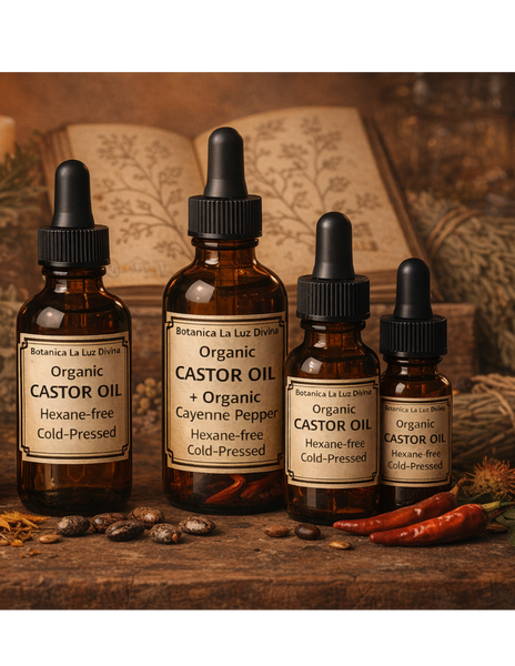 Within apothecary and folk traditions, castor oil has often been applied externally as part of intentional body rituals and used as a carrier oil in herbal preparations. Its deep, nourishing consistency makes it a staple in many holistic practices passed down through generations.