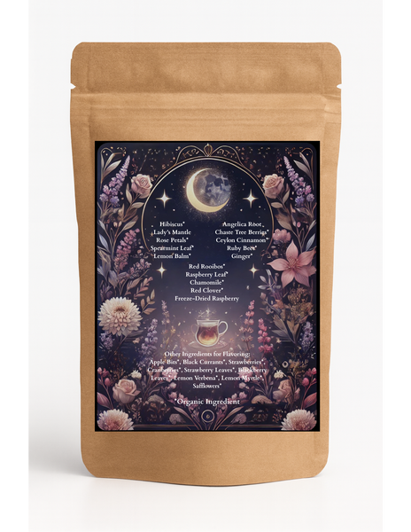 Angelica Root, Chaste Tree Berries*, Ceylon Cinnamon*, Ruby Beet*, Ginger*, Hibiscus*, Lady’s Mantle, Rose Petals*, Spearmint Leaf*, Lemon Balm*, Red Rooibos*, Raspberry Leaf*, Chamomile*, Red Clover*, Freeze-Dried Raspberry.